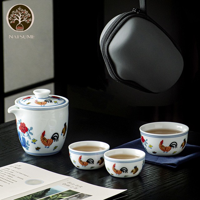 鶏さんとお花の可愛い茶器セットです。 蓋碗の中には茶漉しが付いていて、蓋を裏返せば茶漉し置きに大変身。とってもスマートな設計です。 他に大きめの主人碗が1点、小さめの茶杯が2点、小さなクロスが1点のセットです。 専用ケースにすっぽり収まるので、お出かけ先でも入れたてのお茶が飲めます。 持ち運びが簡単で、コンパクトなので、ベランダやお庭でも ピクニックやキャンプ、旅行や出張でも 自分の好きな茶器と茶葉でゆっくりお茶を淹れてほっと一息しませんか? *セット内容:ケース×1、蓋碗(茶漉し付き)×1、主人碗×1、茶杯×2、クロス×1 *サイズ: ケース L10cm*W8.5cm*H13cm 蓋碗 W9cm*H9cm、170ml 主人碗 W7cm*H3.6cm、75ml 茶杯 W5.8cm*H3cm、40ml *素材:陶磁器 *海外製品です。完璧をお求めの方はご購入をお控え下さい。 *法に基づく検査を受けていないため、食器としての使用はお控えください。当店では装飾用雑貨として販売しております。 *商品写真はできる限り実物の色に近づけるよう徹底しておりますが、 お使いのモニター設定、お部屋の照明等により実際の商品と色味が異なる場合がございます。