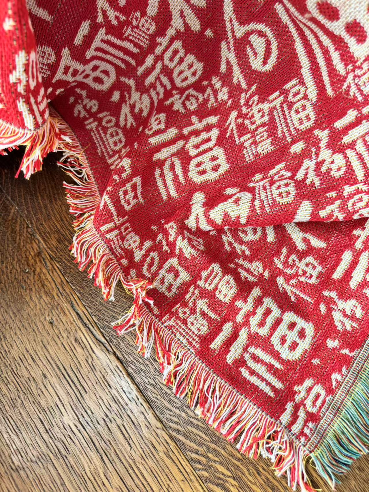 赤地に様々な字体で書かれた福文字が散りばめられているクロスです。