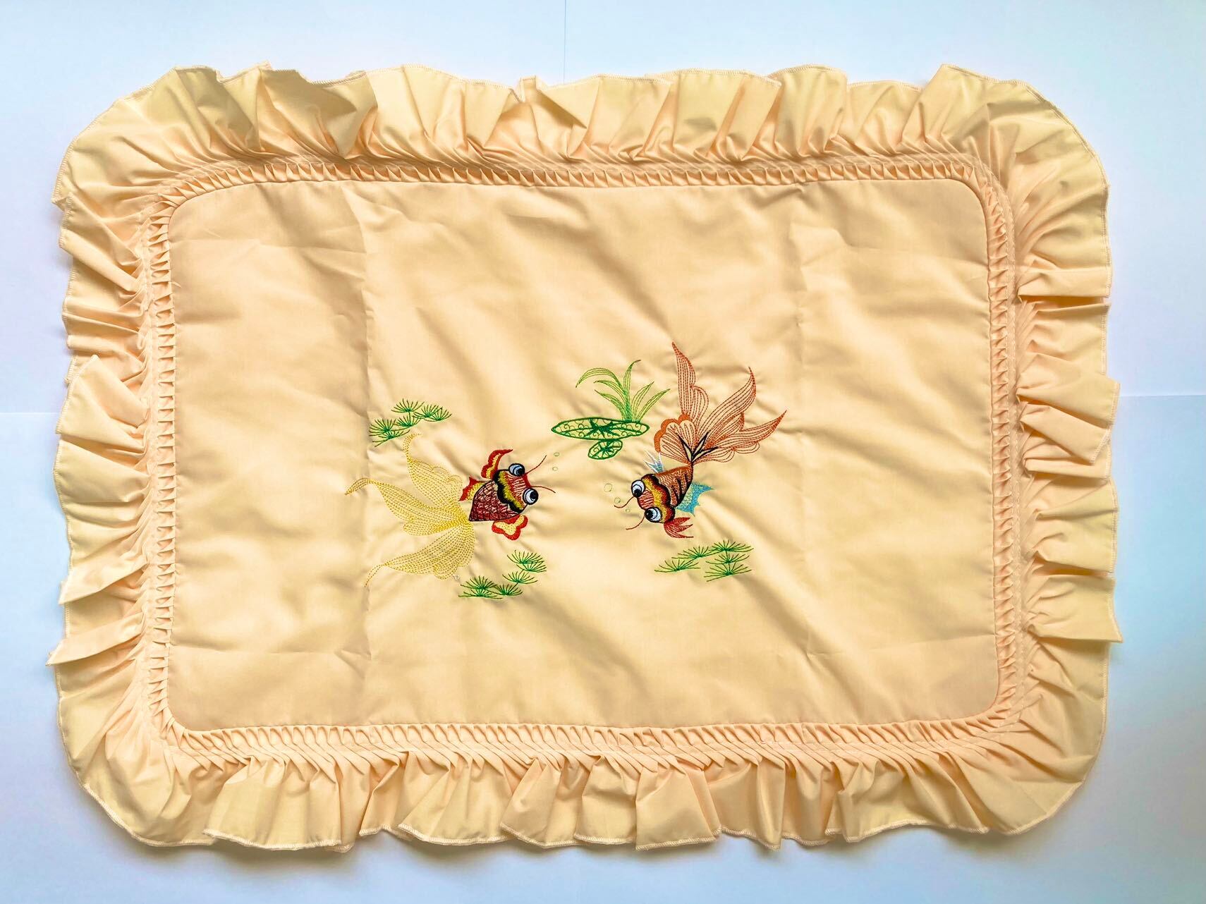 金魚が刺繍されたシャンパン色の上品なフリルの枕カバーです。
