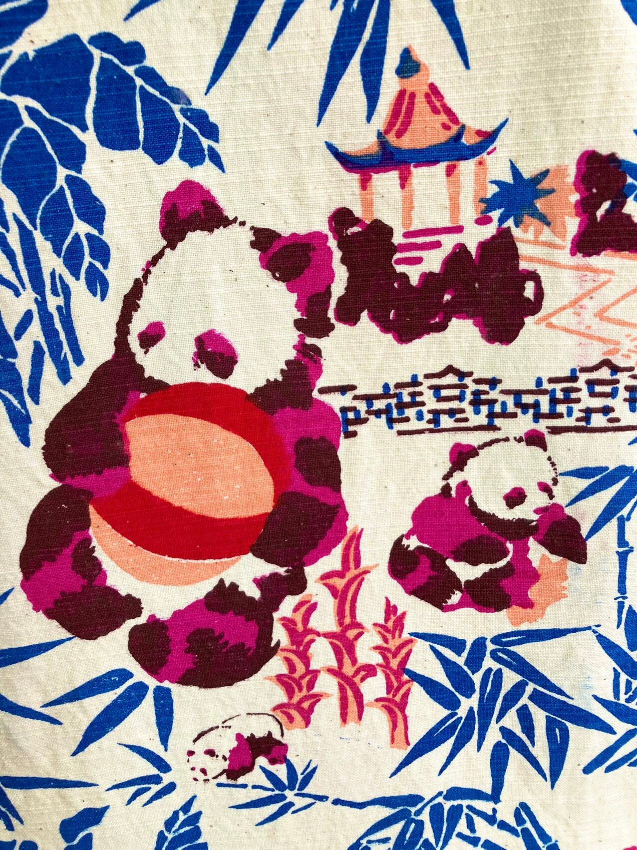 手仕事で作られた綿100%の崇明土布です。手織りと一点一点手作業でプリントした生地は荒く、とっても丈夫です。ボールを持つパンダさんがとても愛らしいです。プリントのかすれやにじみなども手仕事ならではのあじで雰囲気があります。