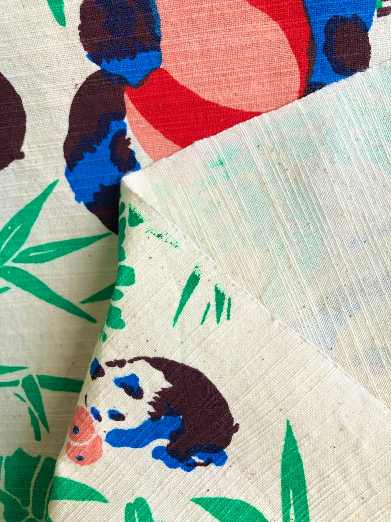 手仕事で作られた綿100%の崇明土布です。手織りと一点一点手作業でプリントした生地は荒く、とっても丈夫です。ボールを持つパンダさんがとても愛らしいです。プリントのかすれやにじみなども手仕事ならではのあじで雰囲気があります。