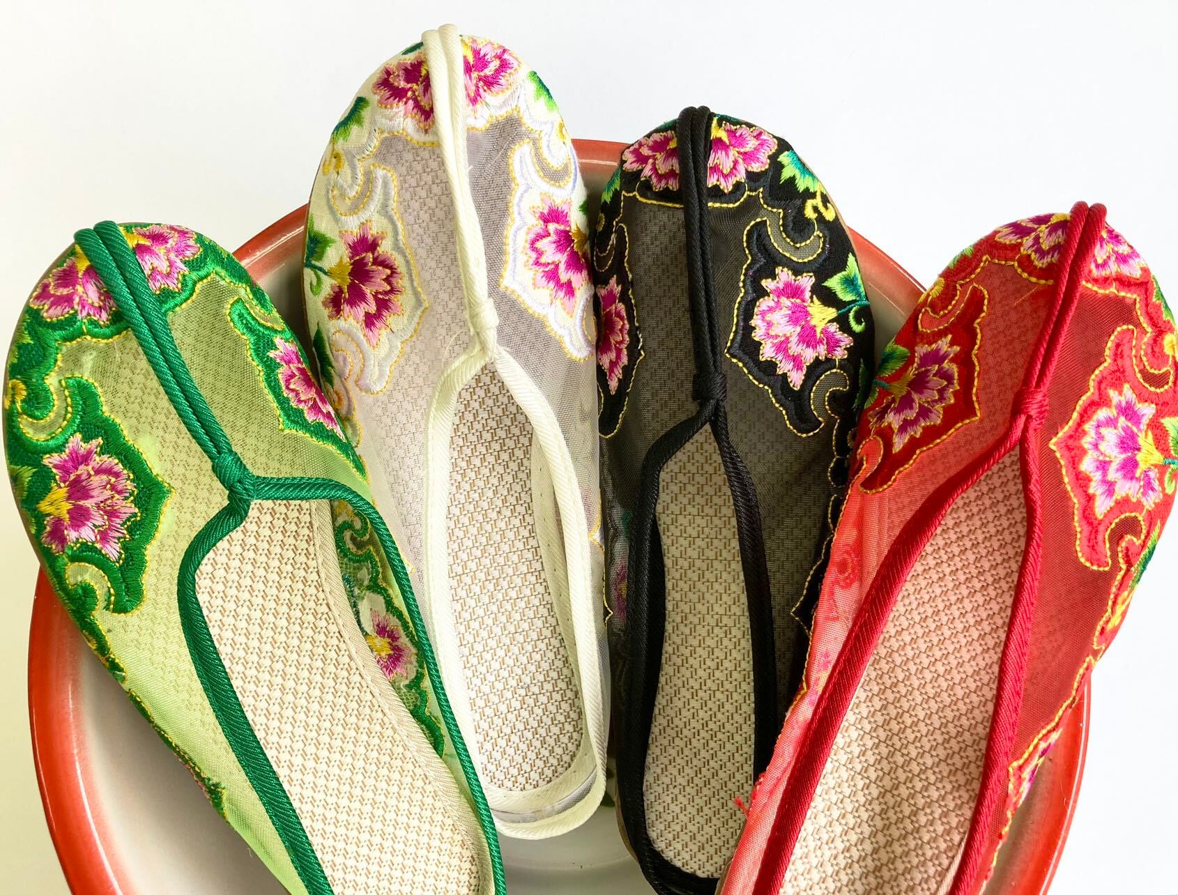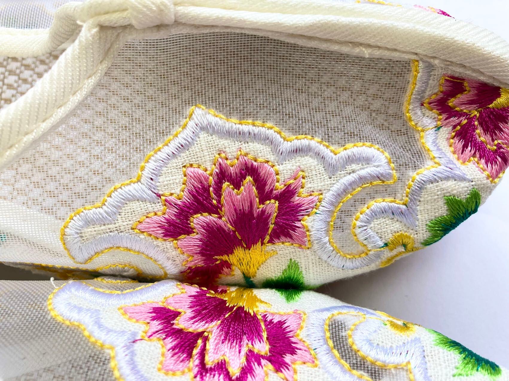 カーネーション刺繍のスケスケチャイナシューズです。黄色の糸で縁取られていて存在感があります。ヒールがあるのでスタイル良く履いていただけます。インソールは吸水性抜群の素材なので汗をかいても安心です。