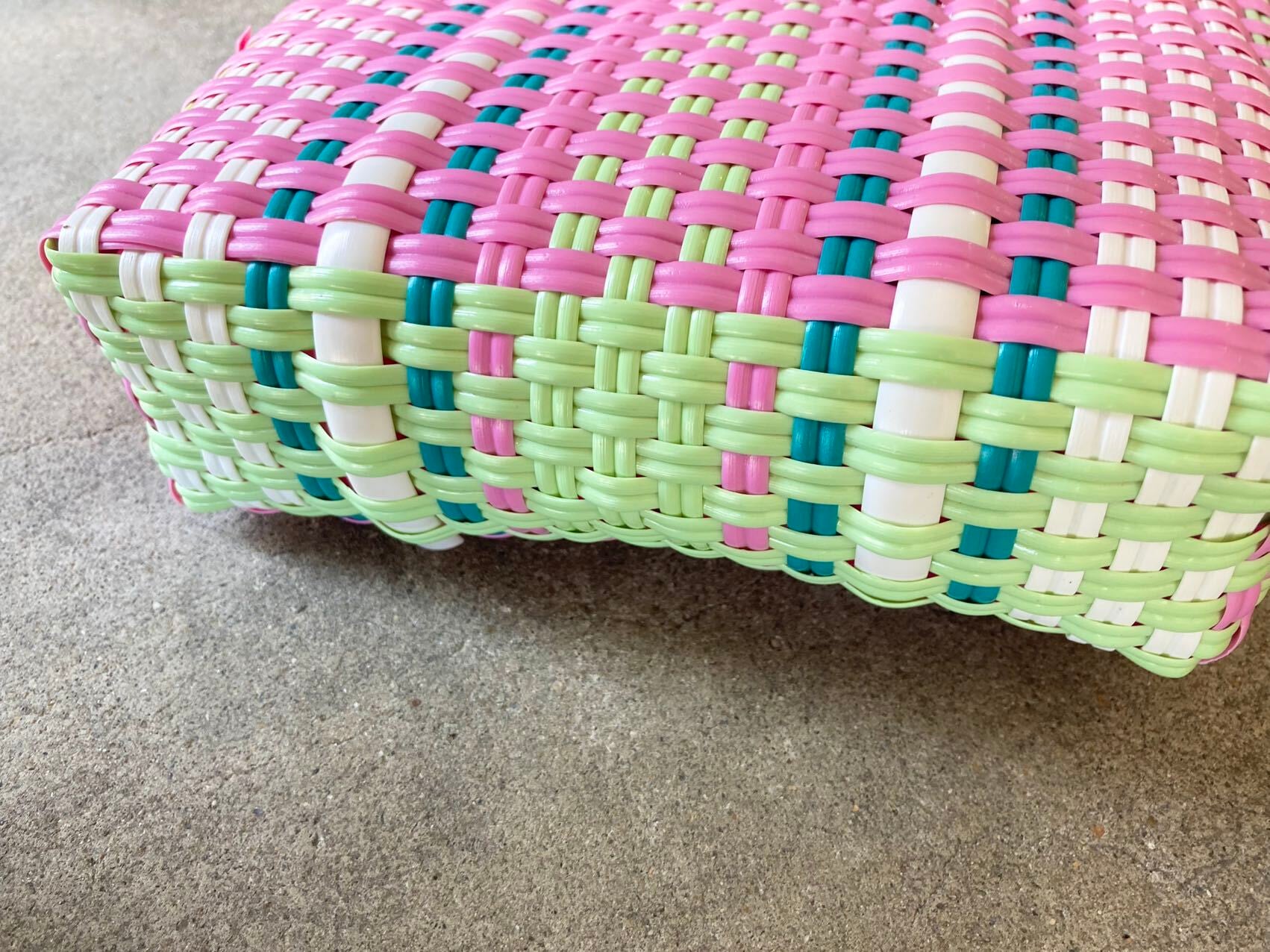 カラフルで小さなカゴバッグです。ビニールなので汚れても簡単に水拭きや丸洗いができます。