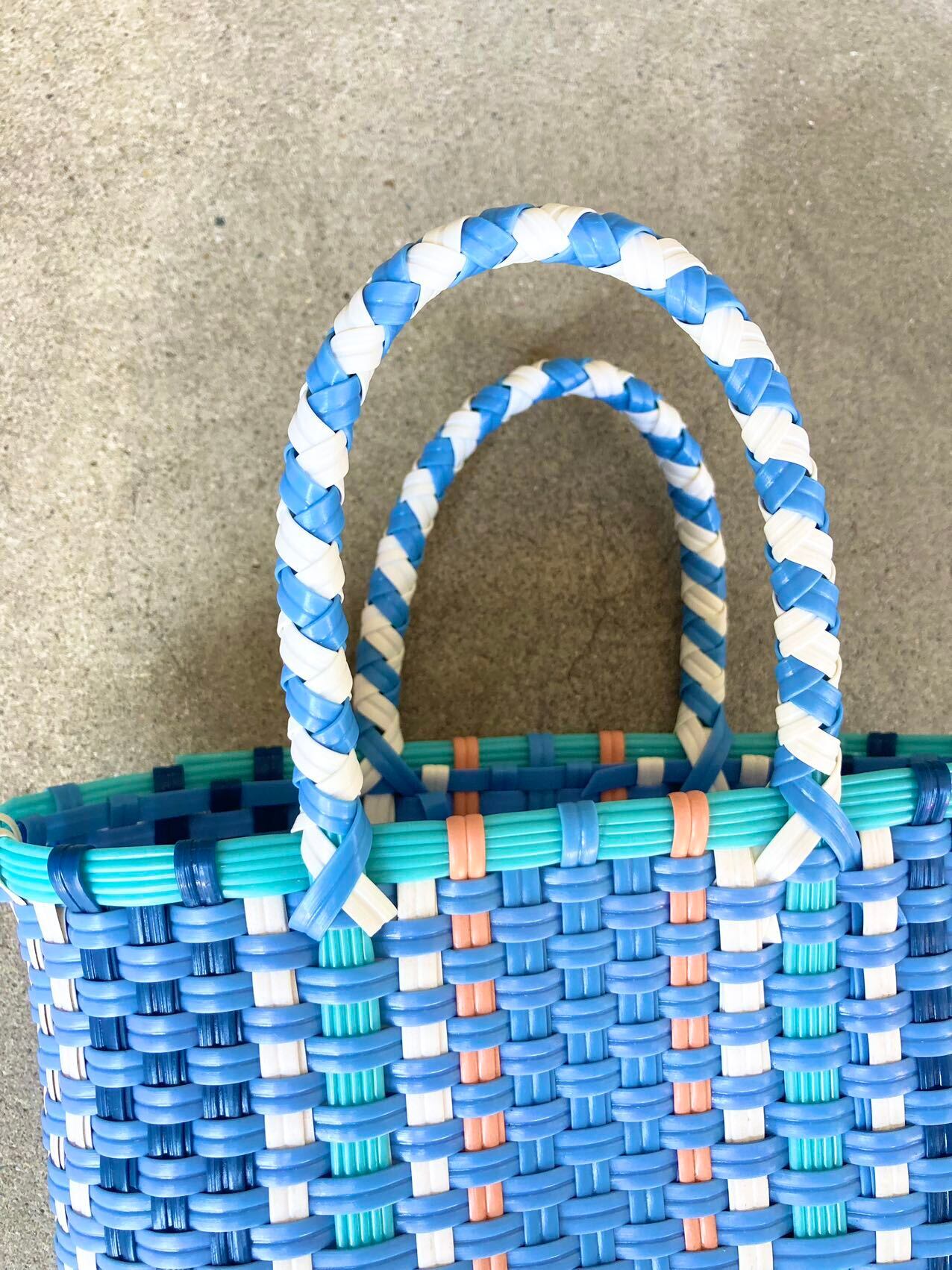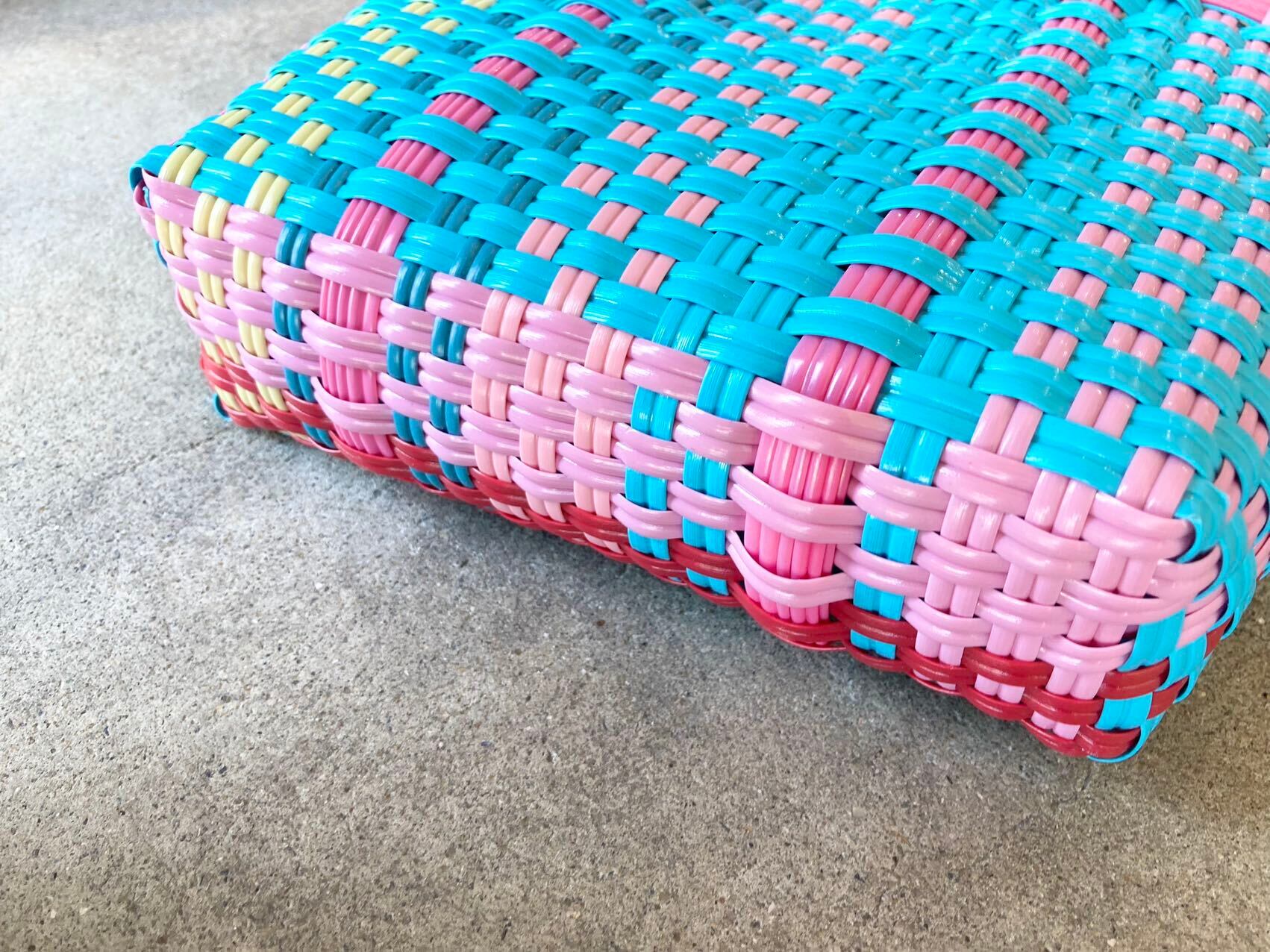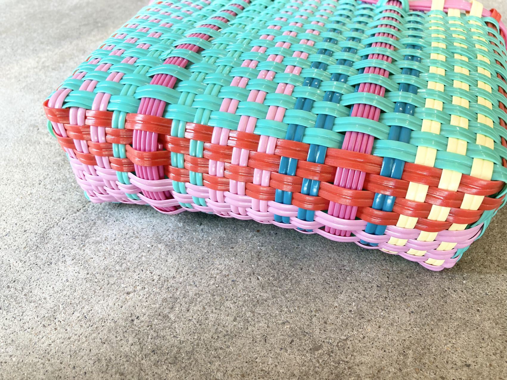 カラフルで小さなカゴバッグです。ビニールなので汚れても簡単に水拭きや丸洗いができます。