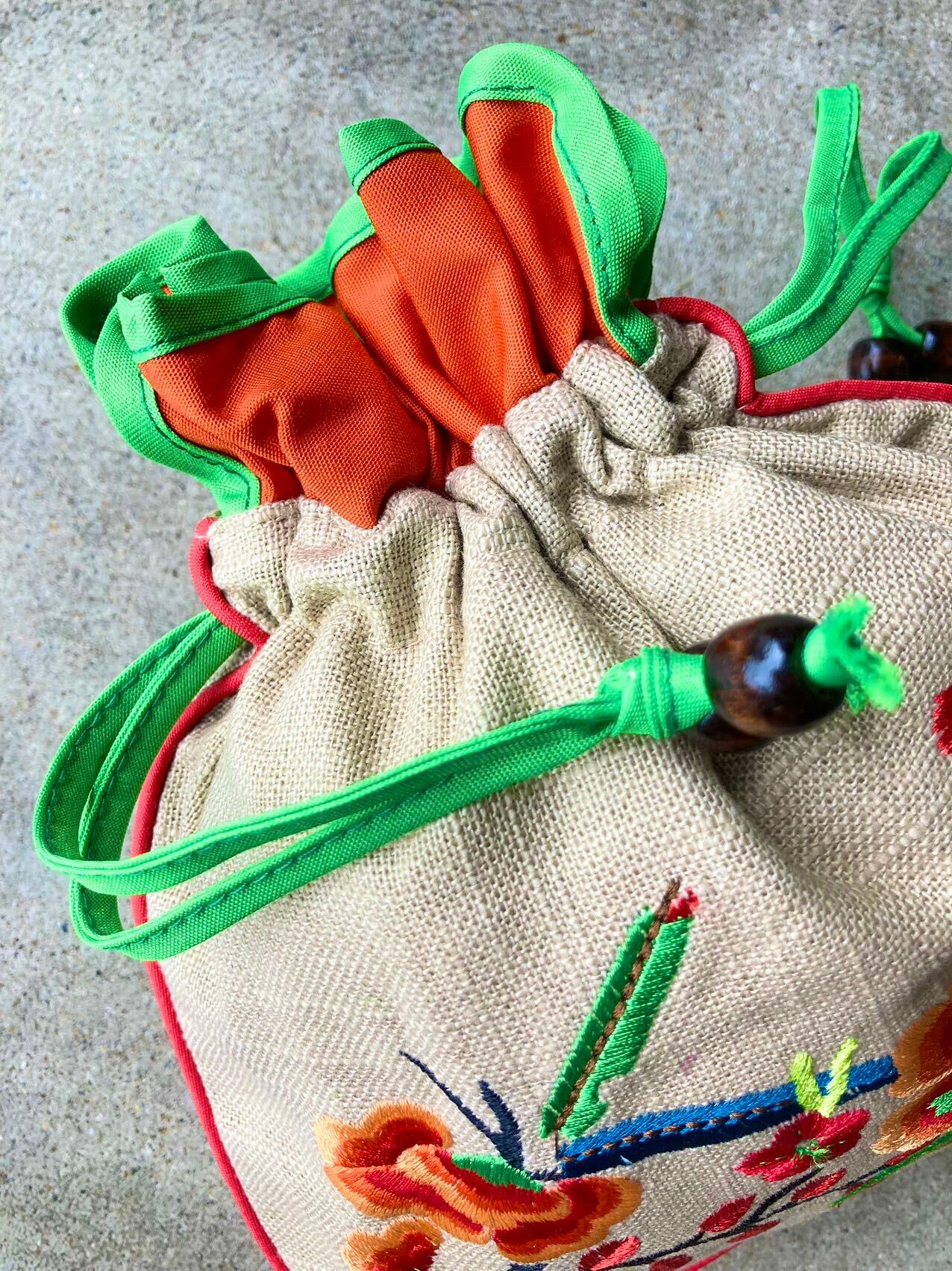 オレンジと蛍光緑の組み合わせがとっても素敵な刺繍ポーチです。
