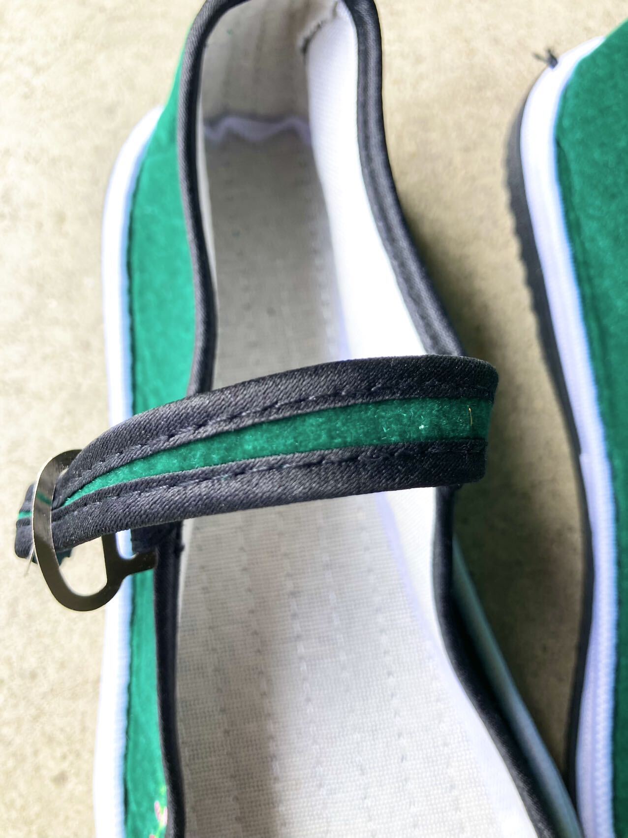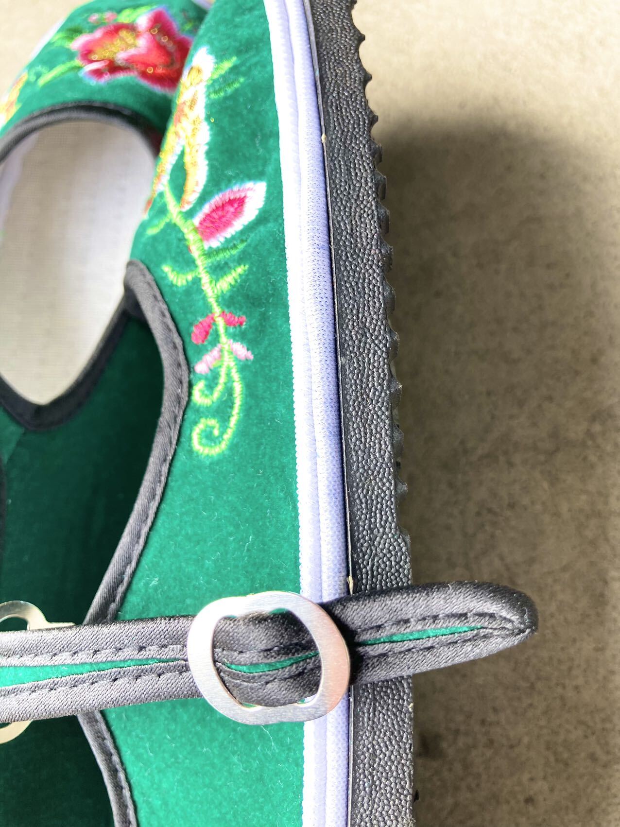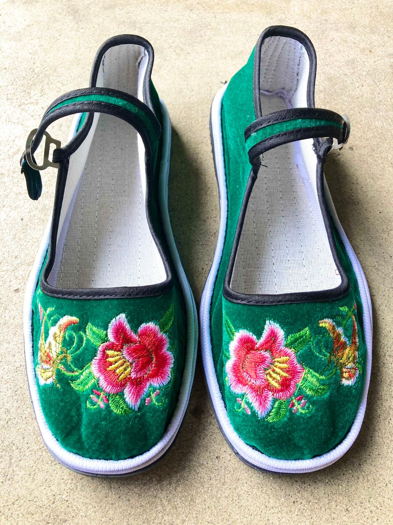 お花と蝶々の刺繍が可愛いベロアのカンフーシューズです。