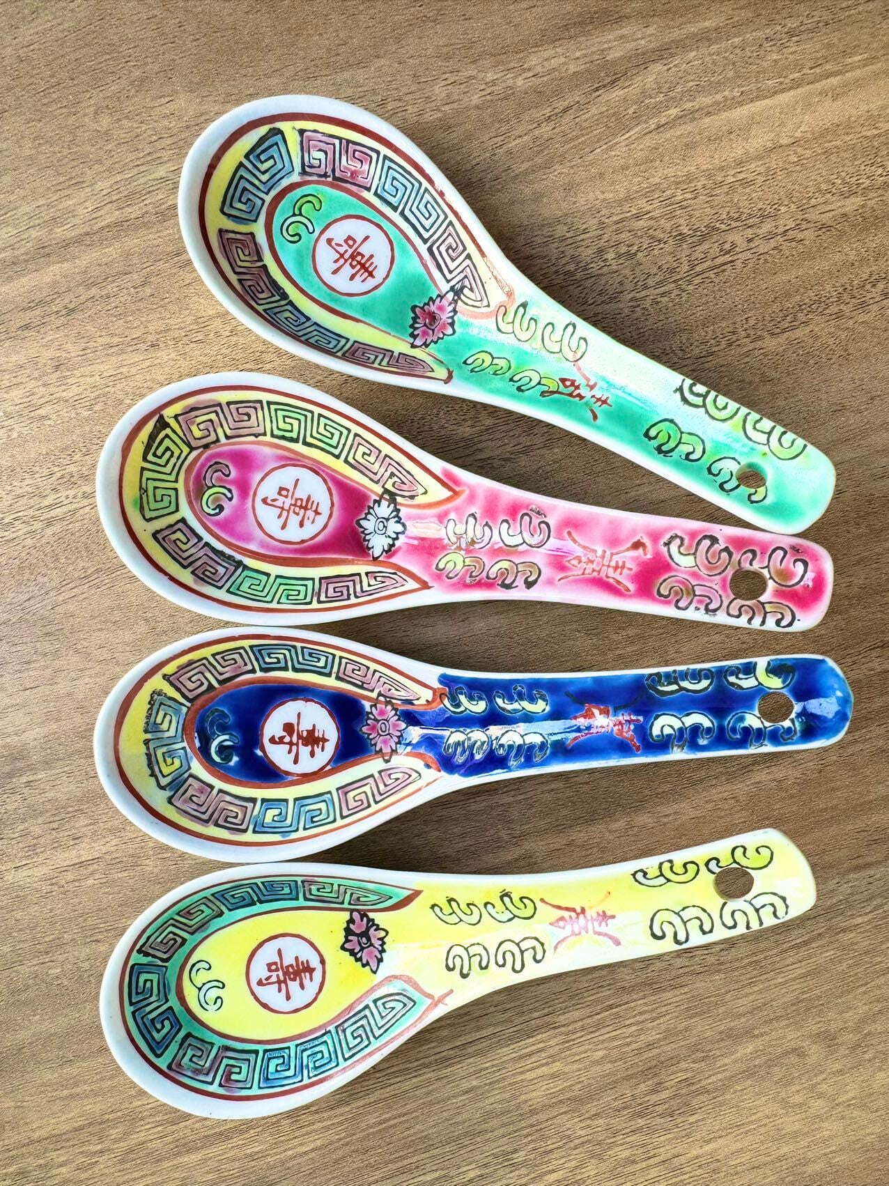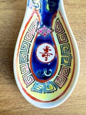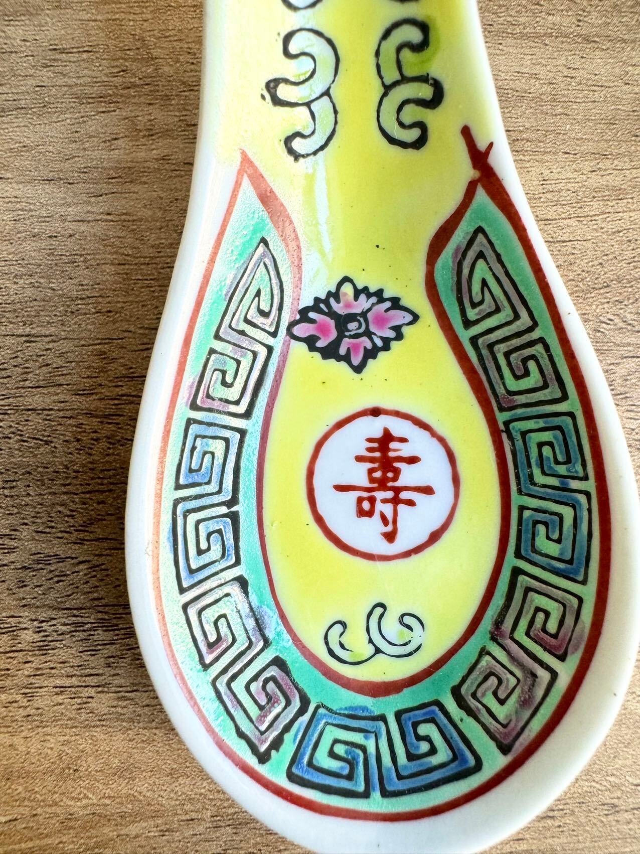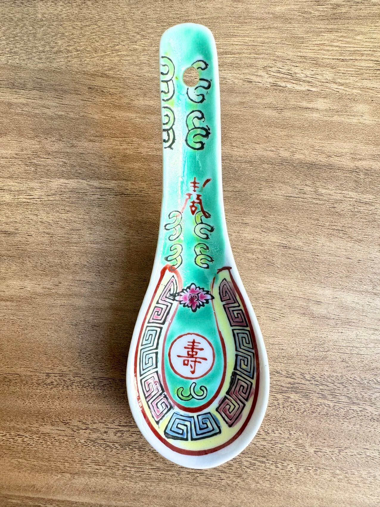 寿が描かれたおめでたいカラフルなレンゲです。景徳鎮では定番の柄!!