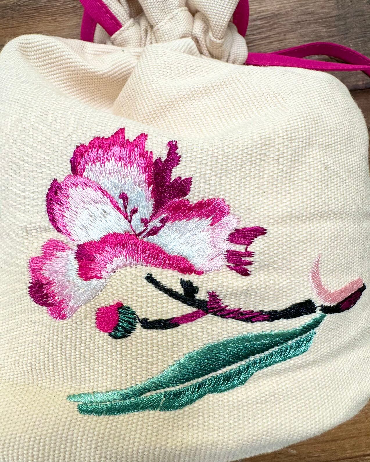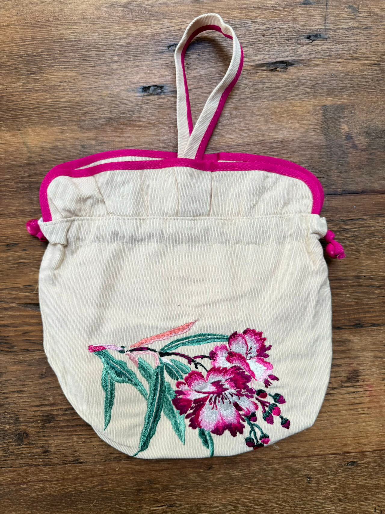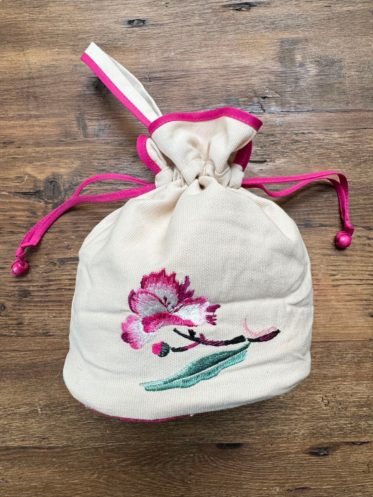 大きな桃の花が刺繍された巾着バッグです。