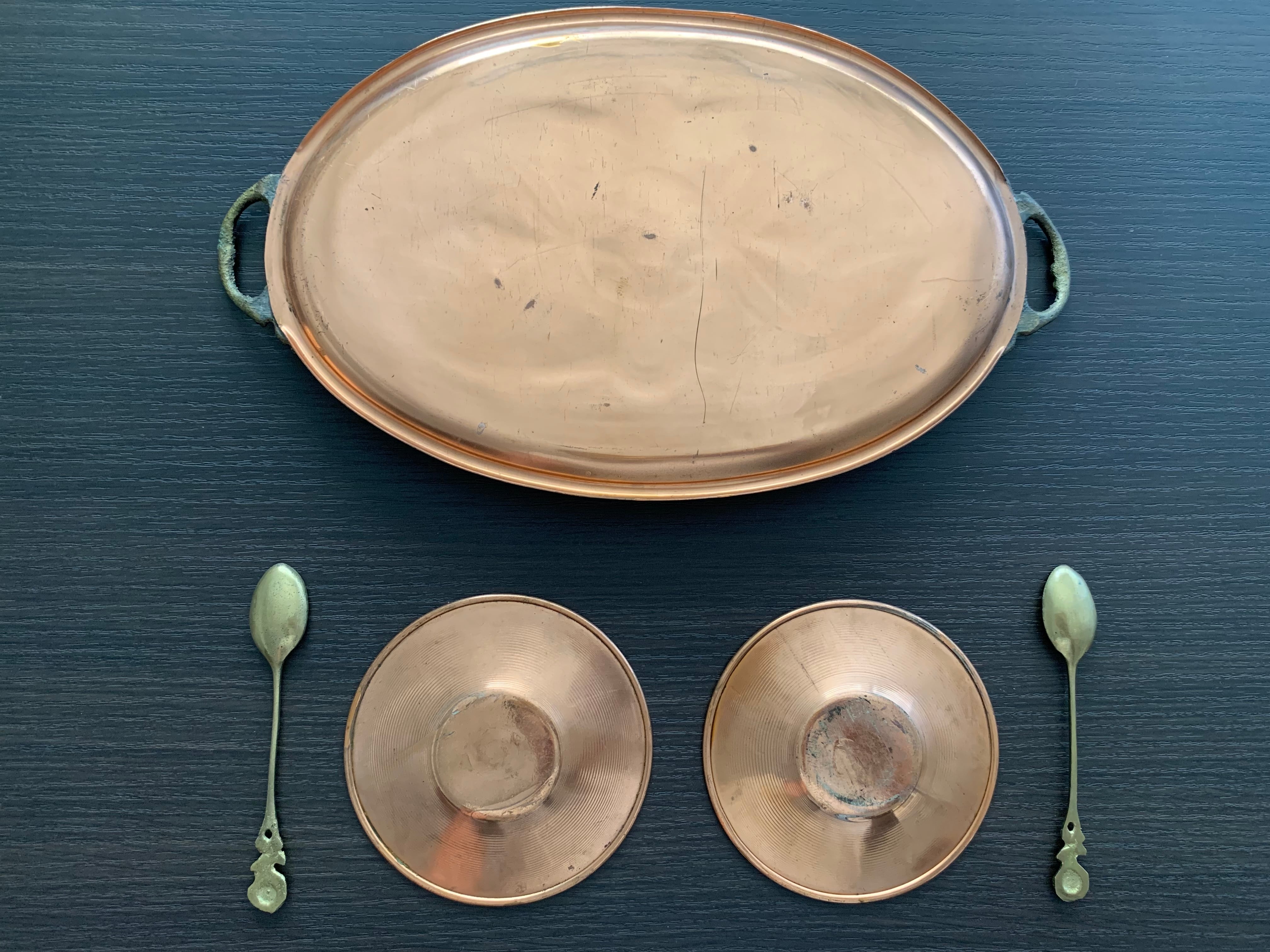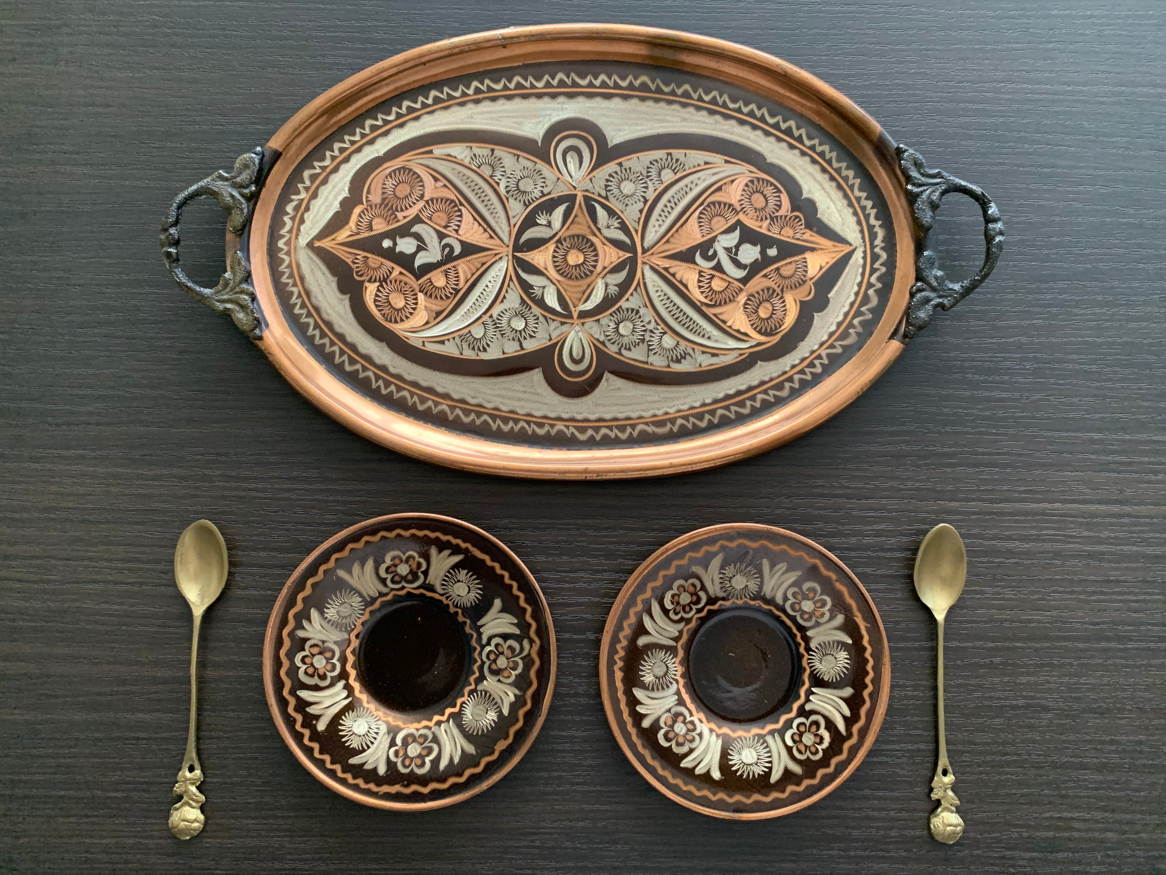 香港の蚤の市で見つけたトルコの銅製アートトレイとソーサー、スプーンのセットです。