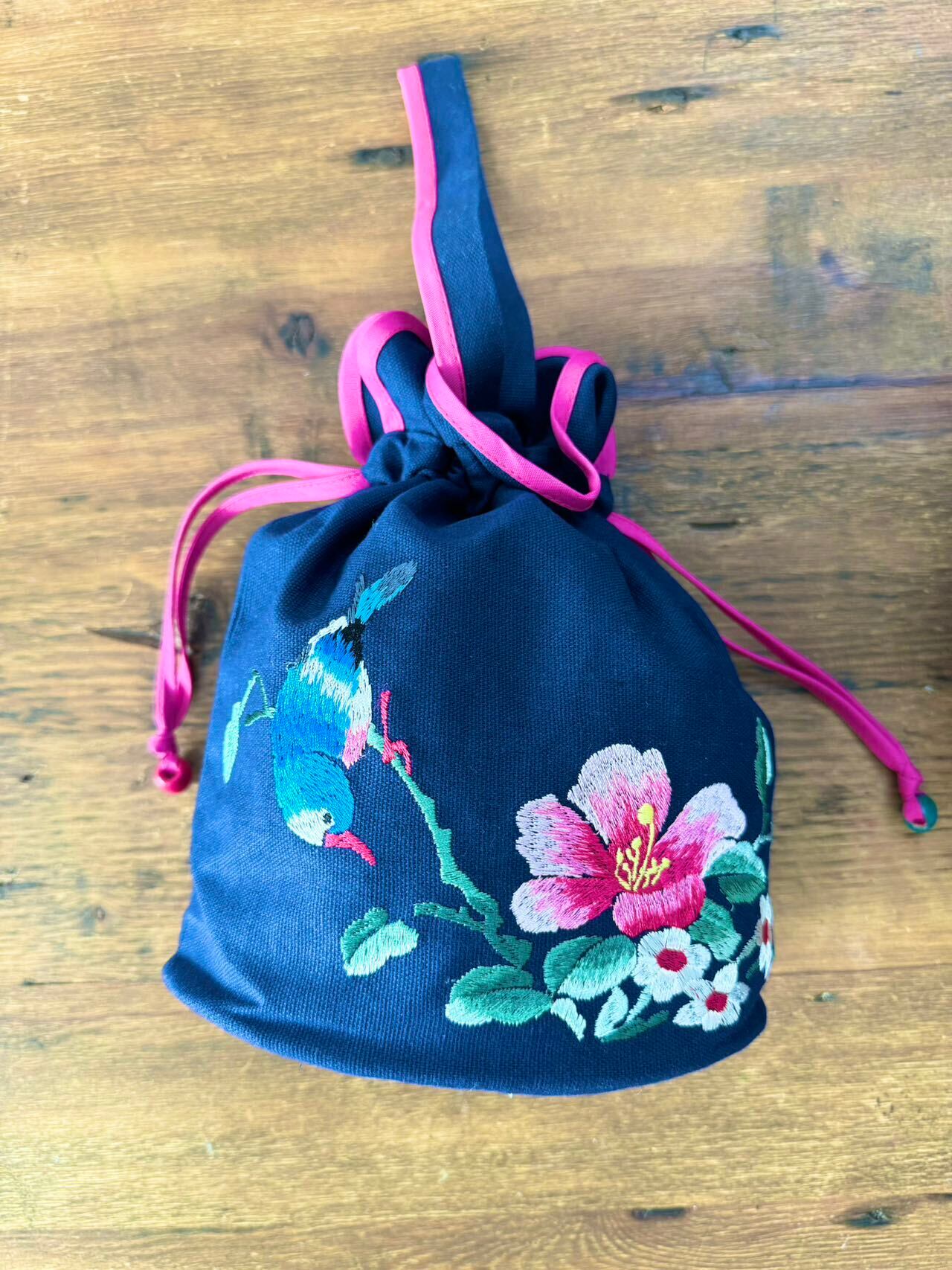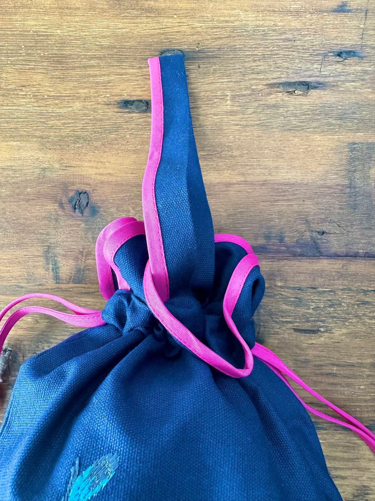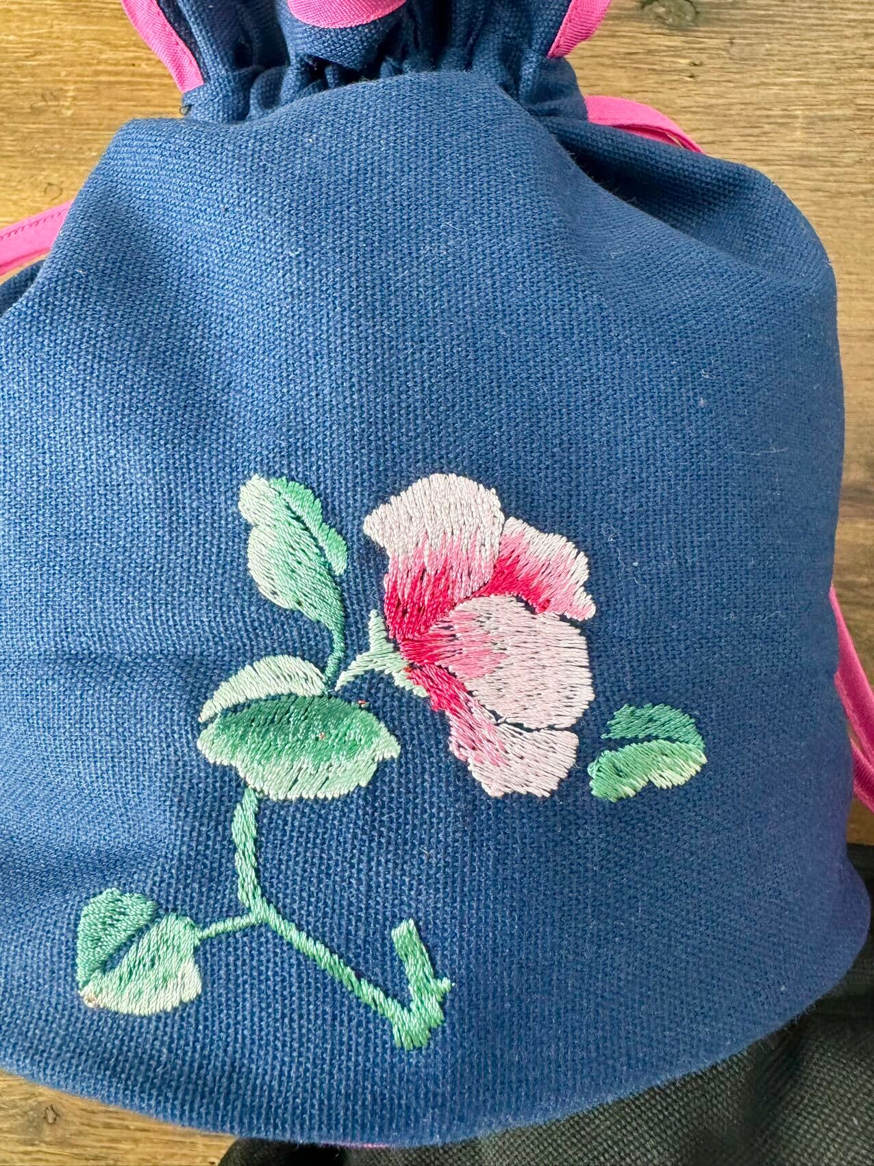 パッと目を惹く鮮やかなブルーの鳥とお花が刺繍された巾着バッグです。