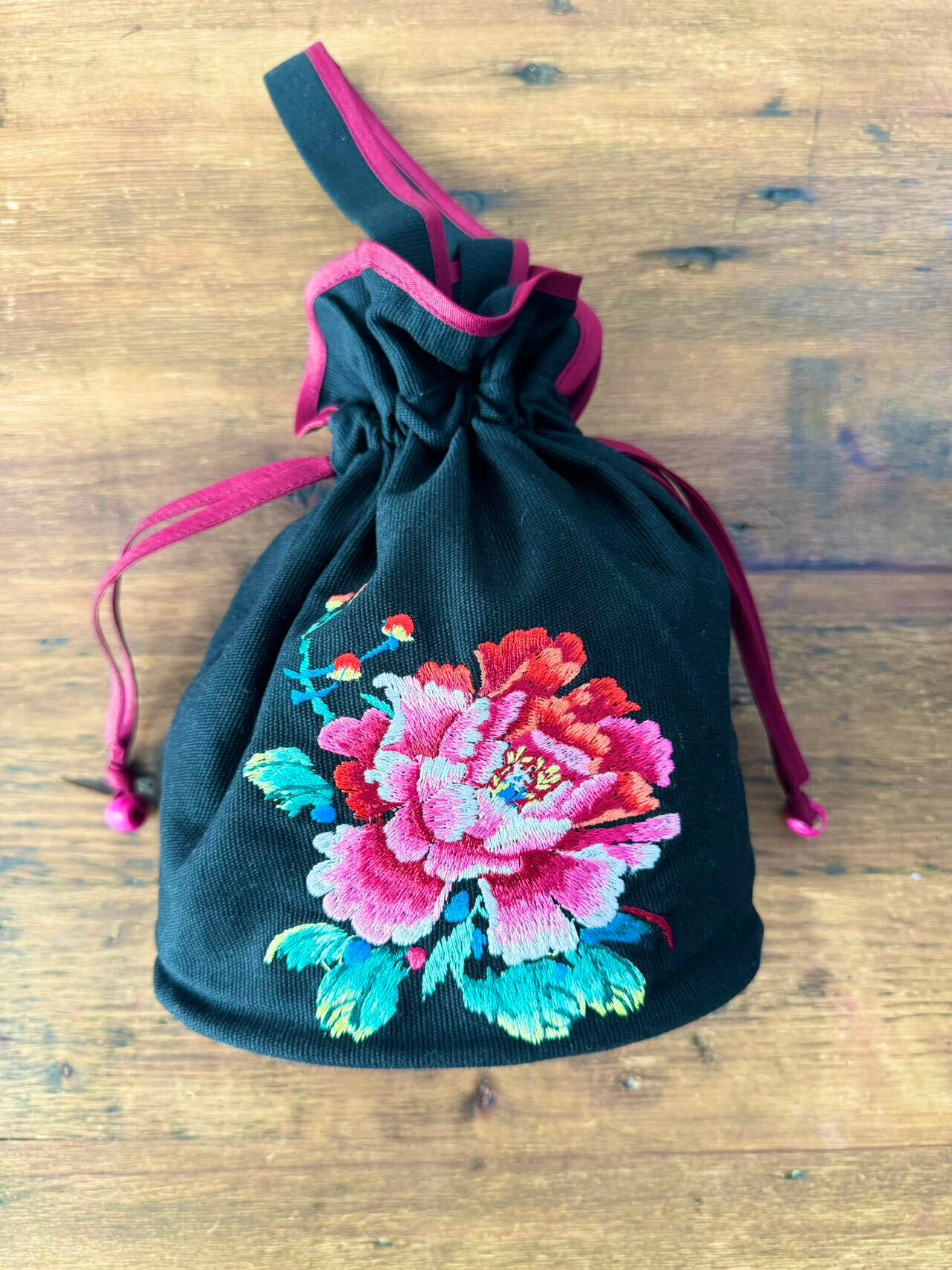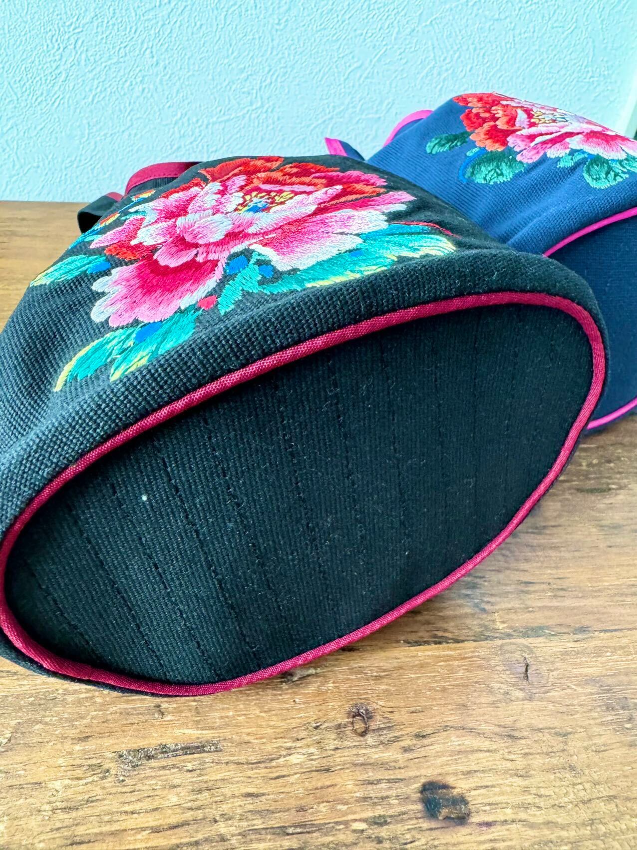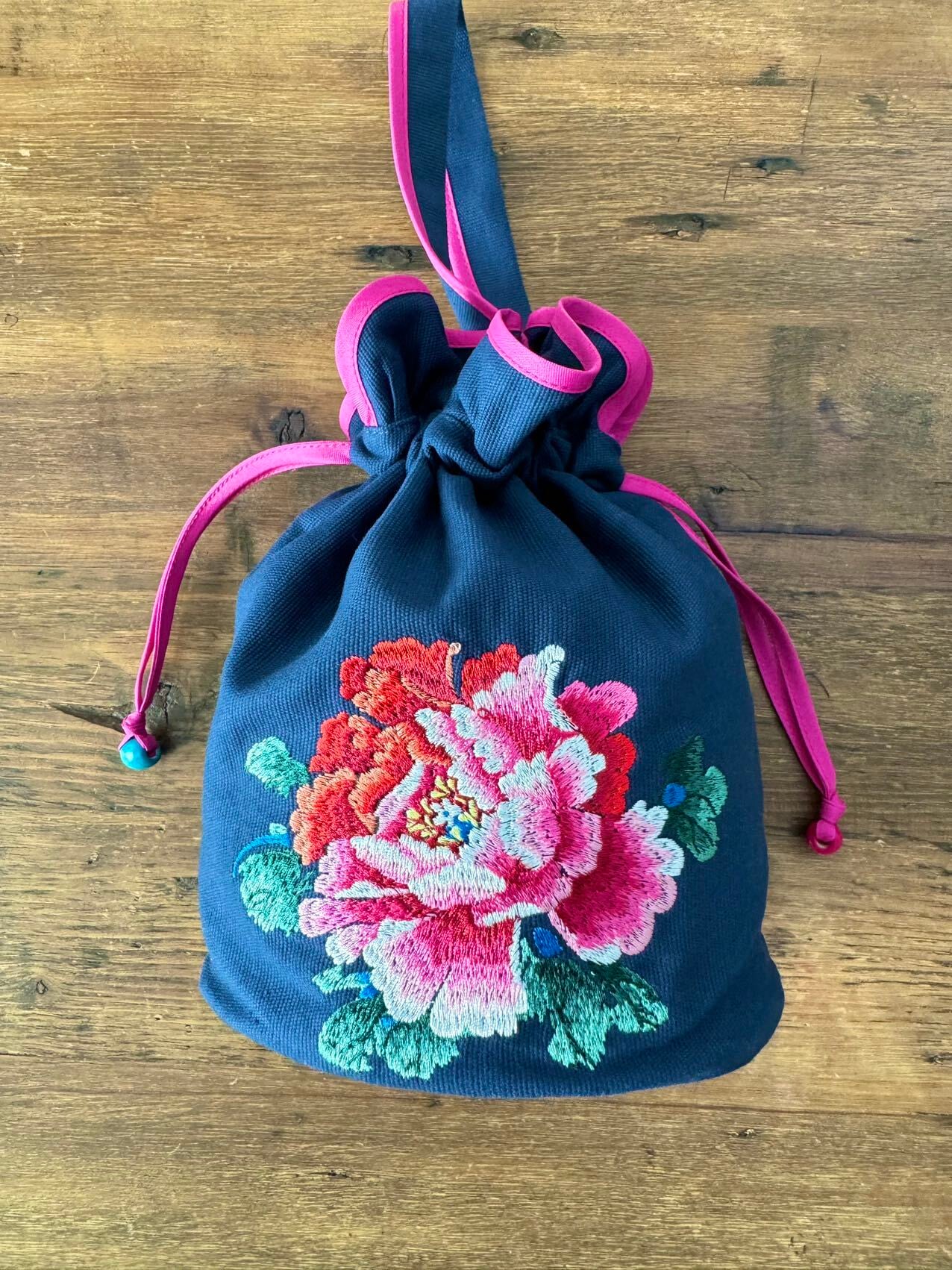 大きな牡丹のお花が刺繍された巾着バッグです。