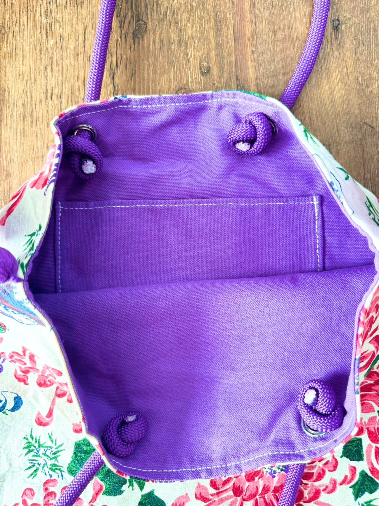 可愛くて大容量で使い勝手抜群。持ち手にしっかりした長さがあるので、肩掛けにできて楽ちん。中にはポケットが一つついており、便利です。
